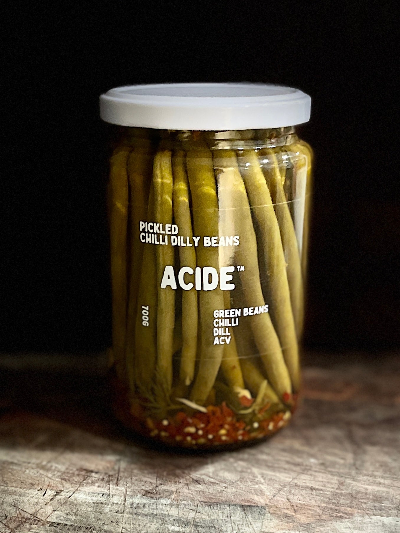 Tangy and savoury green beans in a brine of vinegar, spice and chill. The perfect crunchy snack.