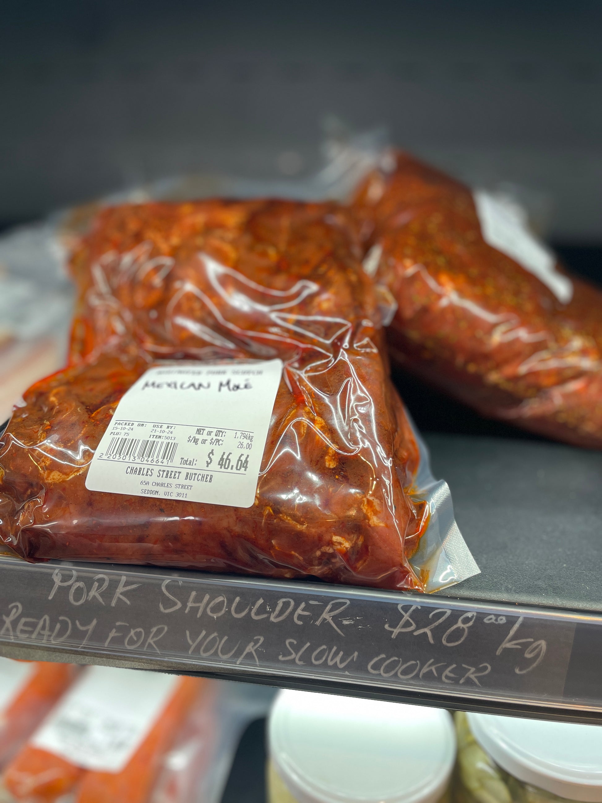Free range pork shoulder marinated and ready to go in the slow cooker or on the smoker.